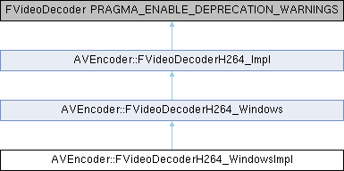Inheritance diagram for AVEncoder::FVideoDecoderH264_WindowsImpl:Public Member Functions | |