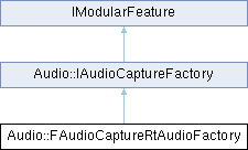 Inheritance diagram for Audio::FAudioCaptureRtAudioFactory:Public Member Functions | |