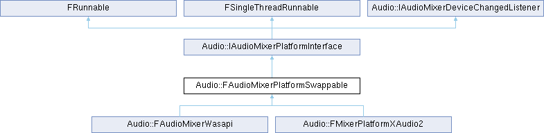 Inheritance diagram for Audio::FAudioMixerPlatformSwappable:Audio mixer platform objects can subclass this in order to add device swap capabilities.