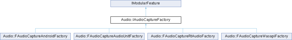 Inheritance diagram for Audio::IAudioCaptureFactory:Public Member Functions | |