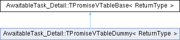 Inheritance diagram for AwaitableTask_Detail::TPromiseVTableBase< ReturnType >:Public Member Functions | |