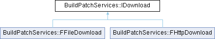 Inheritance diagram for BuildPatchServices::IDownload:Public Member Functions | |