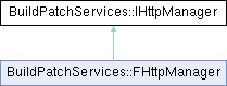 Inheritance diagram for BuildPatchServices::IHttpManager:Public Member Functions | |