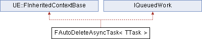 Inheritance diagram for FAutoDeleteAsyncTask< TTask >:Public Member Functions | |
