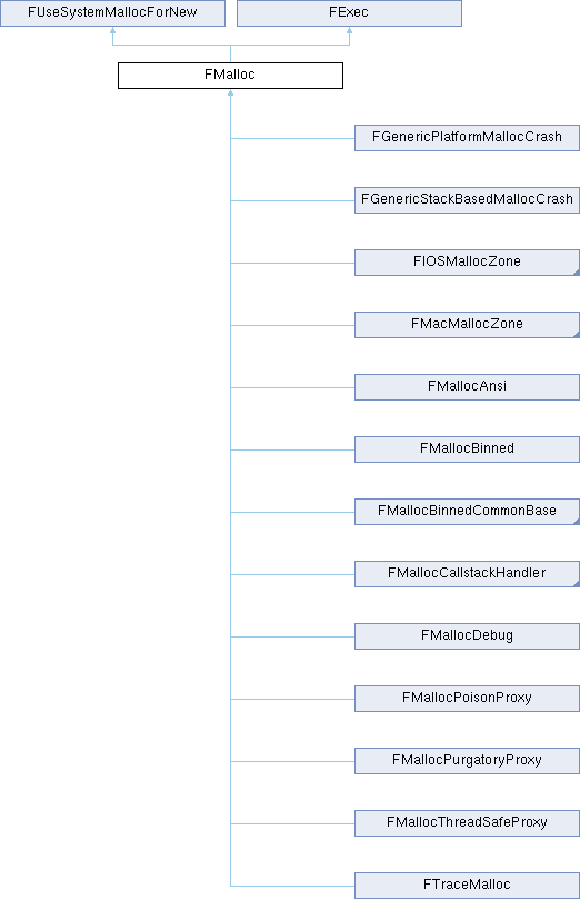 Implemented in FMallocDebug, FTraceMalloc, FMallocCallstackHandler, FMallocPurgatoryProxy, FGenericPlatformMallocCrash, FGenericStackBasedMallocCrash, FMallocAnsi, FMallocBinned, FMallocBinned2, FMallocPoisonProxy, FMallocThreadSafeProxy, FIOSMallocZone, FIOSMallocCrashHandler, FMacMallocZone, and FMacMallocCrashHandler.