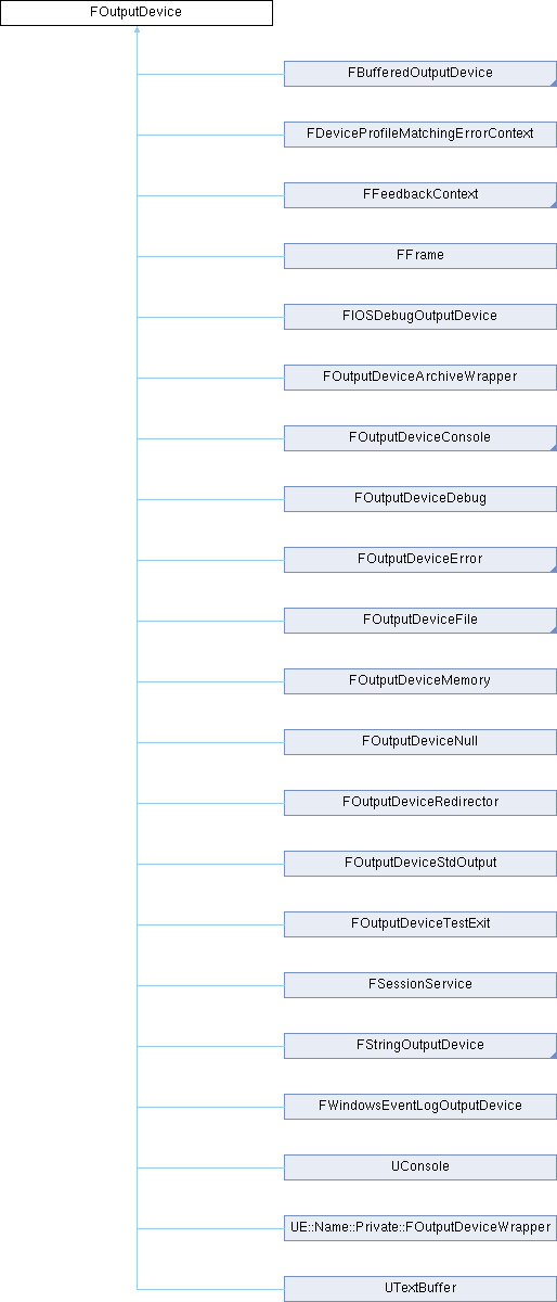 Implemented in UE::Name::Private::FOutputDeviceWrapper, FOutputDeviceRedirector, FOutputDeviceDebug, FBufferedOutputDevice, FStringOutputDevice, TLogCategoryOutputDevice< LogCategoryTypes >, FOutputDeviceStdOutput, FUnixFeedbackContext, FCheckScopeOutputDeviceError, FFilterFeedback, FFeedbackContextAnsi, and FFeedbackContext.