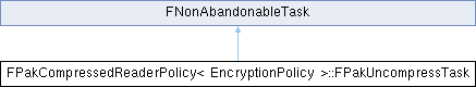 Inheritance diagram for FPakCompressedReaderPolicy< EncryptionPolicy >::FPakUncompressTask:Public Member Functions | |