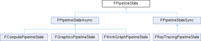 Implemented in FComputePipelineState, FWorkGraphPipelineState, FGraphicsPipelineState, FRayTracingPipelineState, and FPipelineStateSync.