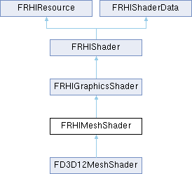 Inheritance diagram for FRHIMeshShader:Additional Inherited Members | ||