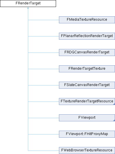 Implemented in FSlateCanvasRenderTarget, FPlanarReflectionRenderTarget, FRenderTargetTexture, FRDGCanvasRenderTarget, FSlateTextureRenderTarget2DResource, FTextureRenderTarget2DArrayResource, FTextureRenderTargetVolumeResource, FTextureRenderTarget2DResource, FTextureRenderTargetCubeResource, FViewport, FViewport::FHitProxyMap, FMediaTextureResource, and FWebBrowserTextureResource.