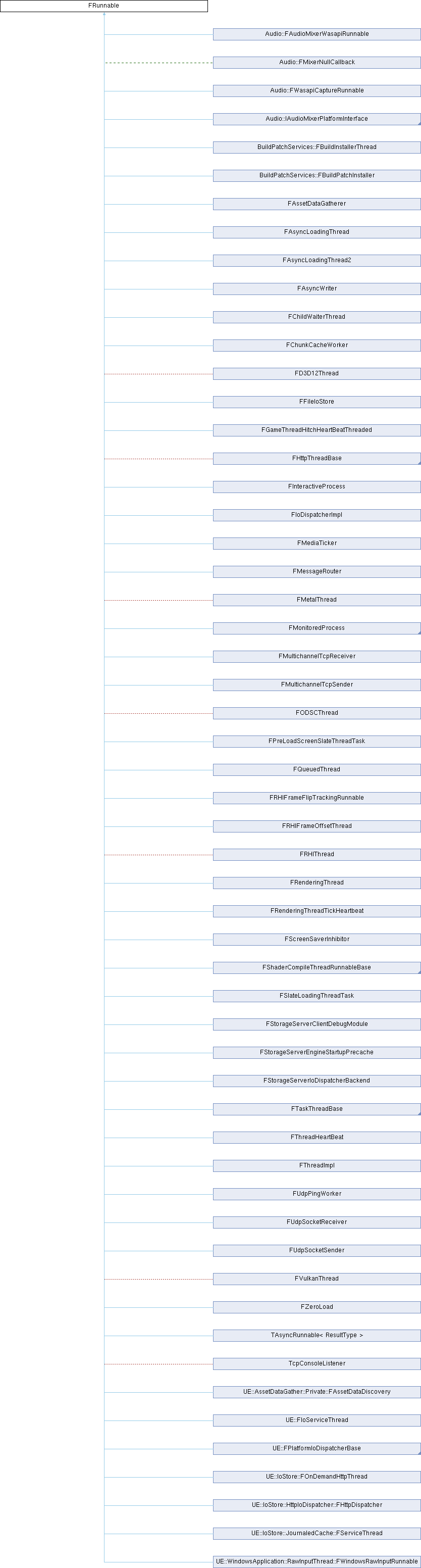 Implemented in FChildWaiterThread, FThreadHeartBeat, FGameThreadHitchHeartBeatThreaded, FAsyncWriter, FAsyncLoadingThread, FShaderCompileThreadRunnableBase, FChunkCacheWorker, FMultichannelTcpReceiver, FMultichannelTcpSender, FAssetDataGatherer, UE::AssetDataGather::Private::FAssetDataDiscovery, Audio::FWasapiCaptureRunnable, Audio::IAudioMixerPlatformInterface, Audio::FMixerNullCallback, FTaskThreadBase, FQueuedThread, TAsyncRunnable< ResultType >, FInteractiveProcess, FMonitoredProcess, FAsyncLoadingThread2, FScreenSaverInhibitor, TcpConsoleListener, FMediaTicker, FMessageRouter, FSlateLoadingThreadTask, FUdpSocketReceiver, FUdpSocketSender, BuildPatchServices::FBuildPatchInstaller, BuildPatchServices::FBuildInstallerThread, FHttpThreadBase, FUdpPingWorker, FFileIoStore, FZeroLoad, FPreLoadScreenSlateThreadTask, FRHIThread, FRHIFrameOffsetThread, FStorageServerIoDispatcherBackend, FStorageServerClientDebugModule, FVulkanThread, Audio::FAudioMixerWasapiRunnable, UE::FPlatformIoDispatcherBase, FODSCThread, FEventLoopHttpThread, FLegacyHttpThread, FRenderingThreadTickHeartbeat, and FRenderingThread.
