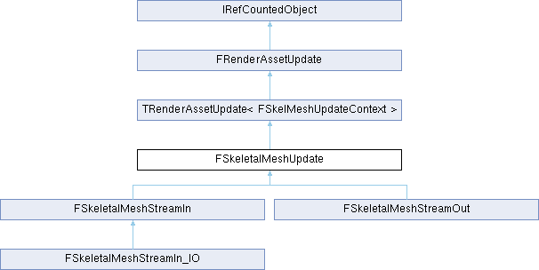 Inheritance diagram for FSkeletalMeshUpdate:This class provides a framework for loading and unloading the LODs of skeletal meshes. Each thread essentially calls Tick() until the job is done. The object can be safely deleted when IsCompleted() returns true.