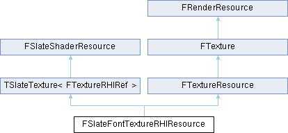 Inheritance diagram for FSlateFontTextureRHIResource:Override for font textures that saves data between Init and ReleaseRHI to ensure all characters in the font texture exist if the rendering resource has to be recreated between caching new characters