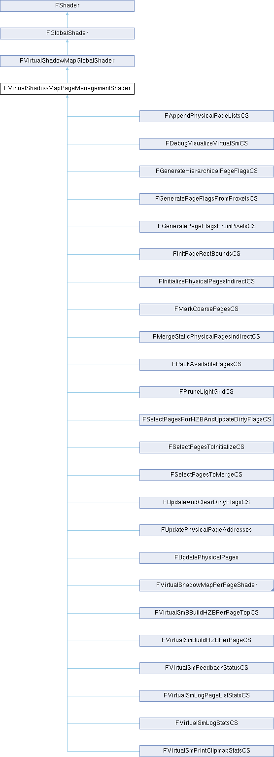Inheritance diagram for FVirtualShadowMapPageManagementShader:Static Public Attributes | |