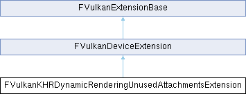 Inheritance diagram for FVulkanKHRDynamicRenderingUnusedAttachmentsExtension:Public Attributes | |