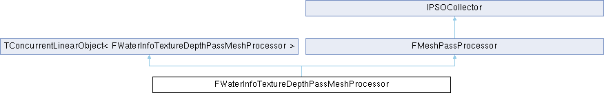 MeshPassProcessor for the two depth-only passes involved in generating the water info texture. The two passes can use the same processor. The first (terrain) pass renders terrain with a fixed grid vertex factory and possibly other static meshes too. The second pass renders dilated water body meshes. All these meshes should only be rendered into this view/texture, which is why MeshBatches need to have the bUseForWaterInfoTextureDepth bool set.