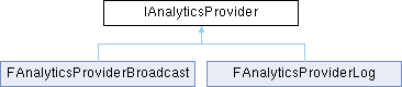 Inheritance diagram for IAnalyticsProvider:Generic interface for an analytics provider. Other modules can define more and register them with this module. See FAnalytics for details.