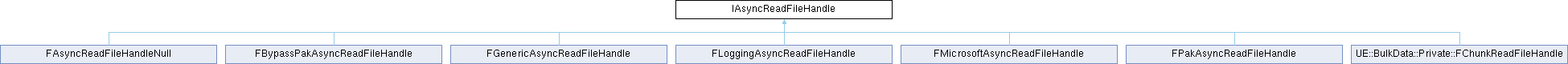 Implemented in FGenericAsyncReadFileHandle, FMicrosoftAsyncReadFileHandle, FAsyncReadFileHandleNull, FLoggingAsyncReadFileHandle, UE::BulkData::Private::FChunkReadFileHandle, FPakAsyncReadFileHandle, and FBypassPakAsyncReadFileHandle.