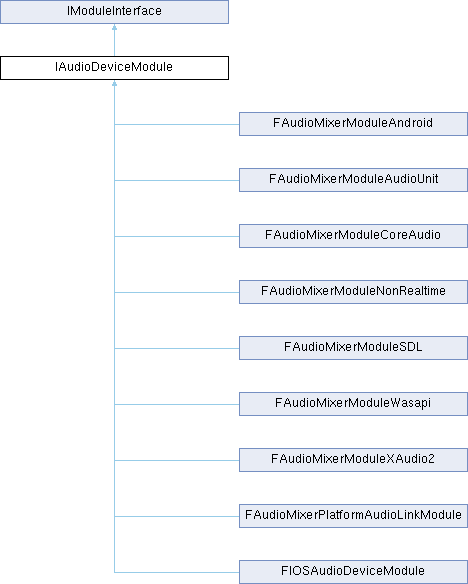 Reimplemented in FAudioMixerPlatformAudioLinkModule, FIOSAudioDeviceModule, FAudioMixerModuleSDL, and FAudioMixerModuleNonRealtime.