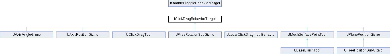 Implemented in UFreeRotationSubGizmo, ULocalClickDragInputBehavior, UAxisAngleGizmo, UAxisPositionGizmo, UPlanePositionGizmo, UBaseBrushTool, UClickDragTool, and UMeshSurfacePointTool.