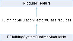 Inheritance diagram for IClothingSimulationFactoryClassProvider:Public Member Functions | |