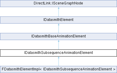 Inheritance diagram for IDatasmithSubsequenceAnimationElement:IDatasmithSubsequenceAnimationElement holds a reference to a IDatasmithLevelSequenceElement, to be played as a subsequence