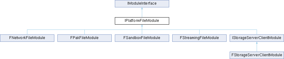 Inheritance diagram for IPlatformFileModule:Public Member Functions | |
