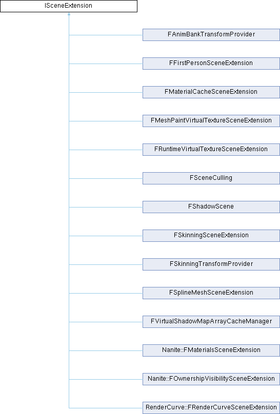 Reimplemented in FSceneCulling, FMaterialCacheSceneExtension, FFirstPersonSceneExtension, RenderCurve::FRenderCurveSceneExtension, Nanite::FMaterialsSceneExtension, Nanite::FOwnershipVisibilitySceneExtension, FSkinningSceneExtension, FSplineMeshSceneExtension, FVirtualShadowMapArrayCacheManager, and FRuntimeVirtualTextureSceneExtension.