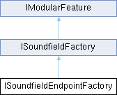 Inheritance diagram for ISoundfieldEndpointFactory:This factory is used to expose Soundfield Endpoint types to the editor. Once a factory is constructed and RegisterEndpointType is called, it will be exposed as a type of endpoint That a submix in the submix graph could be constructed with. Also note that an implementation of ISoundfieldDecoder is not necessary for soundfield formats that are only used for soundfield endpoints.