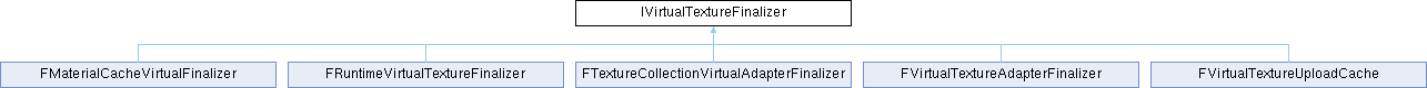 Implemented in FTextureCollectionVirtualAdapterFinalizer, FVirtualTextureAdapterFinalizer, FVirtualTextureUploadCache, FMaterialCacheVirtualFinalizer, and FRuntimeVirtualTextureFinalizer.