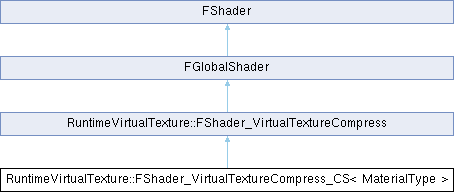 Inheritance diagram for RuntimeVirtualTexture::FShader_VirtualTextureCompress_CS< MaterialType >:Public Types | |