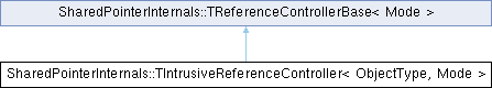 Inheritance diagram for SharedPointerInternals::TIntrusiveReferenceController< ObjectType, Mode >:Public Member Functions | |