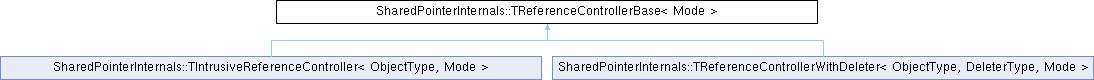 Inheritance diagram for SharedPointerInternals::TReferenceControllerBase< Mode >:Public Member Functions | |