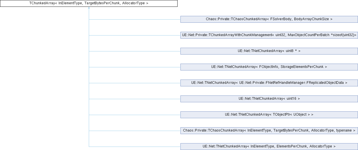 Inheritance diagram for TChunkedArray< InElementType, TargetBytesPerChunk, AllocatorType >:Classes | |