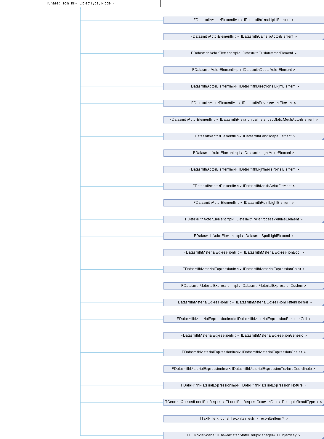 Inheritance diagram for TSharedFromThis< ObjectType, Mode >:Public Member Functions | |