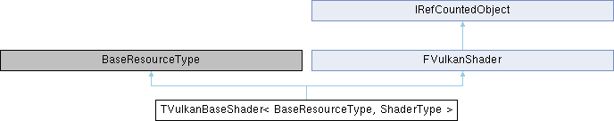 Inheritance diagram for TVulkanBaseShader< BaseResourceType, ShaderType >:Public Types | |