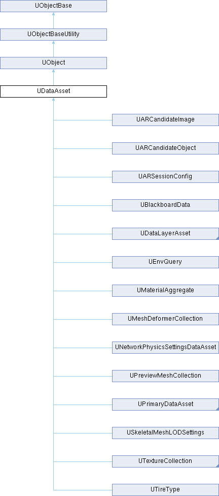 Create a simple asset that stores data related to a particular system in an instance of this class. Assets can be made in the Content Browser using any native class that inherits from this. If you want data inheritance or a complicated hierarchy, Data Only Blueprint Classes should be created instead.
