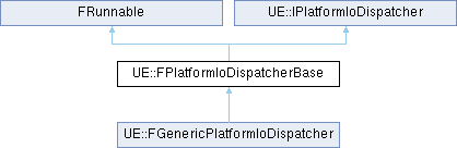 Inheritance diagram for UE::FPlatformIoDispatcherBase:This is a base class for platform specific I/O dispatcher implementations. There are two kinds of I/O requests when reading data from disk. Direct-read requests for platforms with hardware decompression and scatter-gather requests. Scatter-gather requests are issued by specifying information about how the blocks on disk are encoded, i.e. compressed, encrypted and or signed and forms a set of encoded block request. Encoded block requests can be shared between user requests, i.e. if two user requests are reading the same encoded block, the block is decoded once and then scattered to the destination/targets buffers. The encoded block requests are devided into a set of larger file block requests. The size of the file blocks are configured with GIoDispatcherBufferSizeKB (default=256KiB). The maximum number of concurrent file block requests are constrained by the available memory in the file block memory pool configured with GIoDispatcherBufferMemoryMB (default=8MiB).