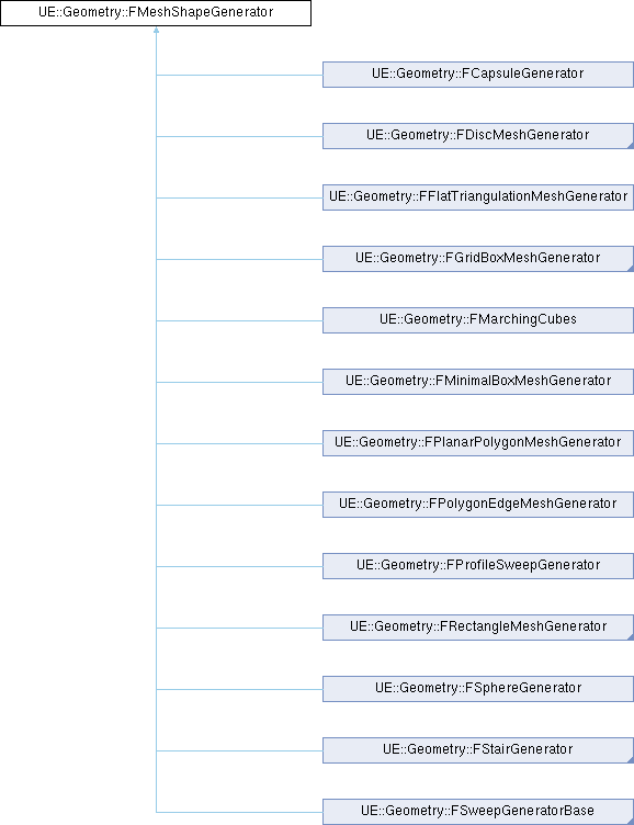 Implemented in UE::Geometry::FPolygonEdgeMeshGenerator, UE::Geometry::FBoxSphereGenerator, UE::Geometry::FCapsuleGenerator, UE::Geometry::FDiscMeshGenerator, UE::Geometry::FPuncturedDiscMeshGenerator, UE::Geometry::FFlatTriangulationMeshGenerator, UE::Geometry::FGridBoxMeshGenerator, UE::Geometry::FMarchingCubes, UE::Geometry::FMinimalBoxMeshGenerator, UE::Geometry::FPlanarPolygonMeshGenerator, UE::Geometry::FRectangleMeshGenerator, UE::Geometry::FRoundedRectangleMeshGenerator, UE::Geometry::FSphereGenerator, UE::Geometry::FStairGenerator, UE::Geometry::FCylinderGenerator, UE::Geometry::FArrowGenerator, UE::Geometry::FGeneralizedCylinderGenerator, and UE::Geometry::FProfileSweepGenerator.