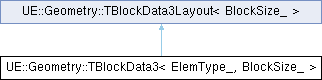 Inheritance diagram for UE::Geometry::TBlockData3< ElemType_, BlockSize_ >:Public Types | |