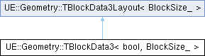 Inheritance diagram for UE::Geometry::TBlockData3< bool, BlockSize_ >:Public Member Functions | |
