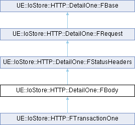 Inheritance diagram for UE::IoStore::HTTP::DetailOne::FBody:Public Member Functions | |