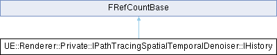 Inheritance diagram for UE::Renderer::Private::IPathTracingSpatialTemporalDenoiser::IHistory:Public Member Functions | |