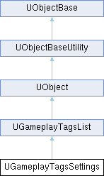 Class for importing GameplayTags directly from a config file. FGameplayTagsEditorModule::StartupModule adds this class to the Project Settings menu to be edited. Editing this in Project Settings will output changes to Config/DefaultGameplayTags.ini.