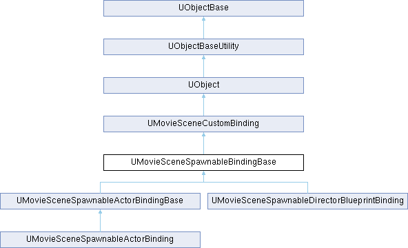 The base class for custom spawnable bindings. A spawnable binding will spawn an object upon resolution or return a cached previously spawned object. UMovieSceneSpawnableActorBinding is the reimplementation of previous FMovieSceneSpawnable features and spawns an actor based on a saved template and actor class. Otherwise, projects are free to implement their own Spawnable bindings by overriding this class. In doing so, they could choose to just override GetSpawnObjectClass, PostSpawnObject, and PreDestroyObject for example to do custom post-spawn setup on a character mesh, or they could choose to fully override SpawnObject and DestroySpawnedObject and do their own custom logic for spawning completely.