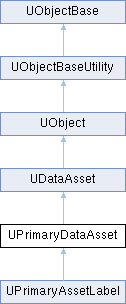 A DataAsset that implements GetPrimaryAssetId and has asset bundle support, which allows it to be manually loaded/unloaded from the AssetManager. Instances of native subclasses can be created directly as Data Assets in the editor and will use the name of the native class as the PrimaryAssetType. Or, blueprint subclasses can be created to add variables and then subclassed again by Data Only Blueprints that set those variables. With blueprint subclasses, use Data Only Blueprints (and not Data Asset instances) to properly handle data inheritance and updating the parent class.