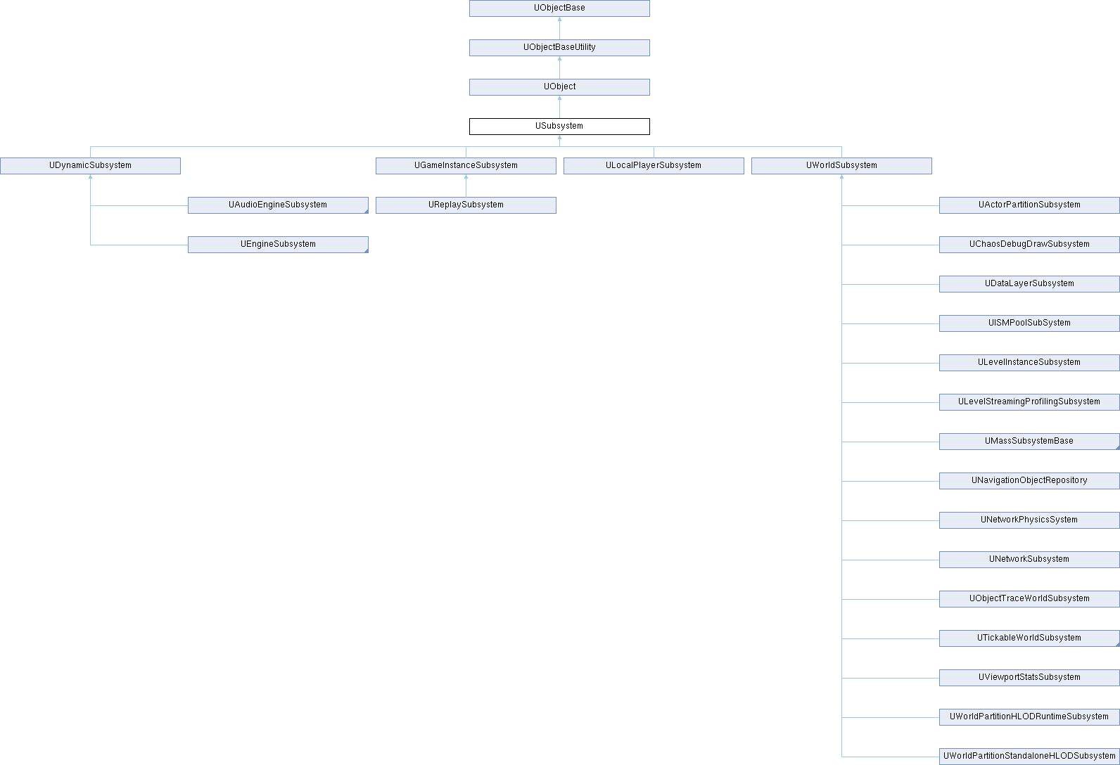 Currently supported Subsystem lifetimes are: Engine -> inherit UEngineSubsystem Editor -> inherit UEditorSubsystem GameInstance -> inherit UGameInstanceSubsystem World -> inherit UWorldSubsystem LocalPlayer -> inherit ULocalPlayerSubsystem