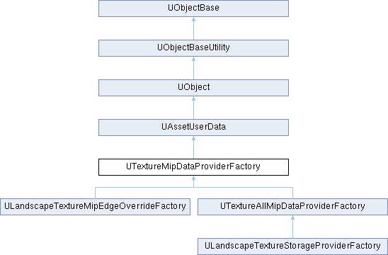 UTextureMipDataProviderFactory defines an interface to create instances of FTextureMipDataProvider. Derived classes from UTextureMipDataProviderFactory can be attached to UTexture::MipDataProviderFactory to define a new source for mip content (instead of the default disk file or ddc mips). Usecases include dynamic textures that need to be driven by the texture streaming or textures that get they data over the network.