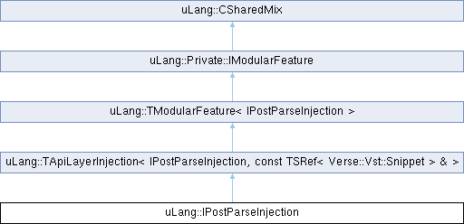 Inheritance diagram for uLang::IPostParseInjection:Additional Inherited Members | |