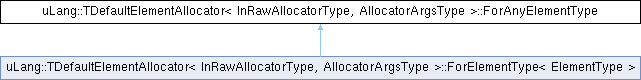 Inheritance diagram for uLang::TDefaultElementAllocator< InRawAllocatorType, AllocatorArgsType >::ForAnyElementType:A class that may be used when NeedsElementType=false is specified. If NeedsElementType=true, then this must be present but will not be used, and so can simply be a typedef to void
